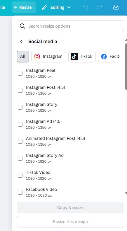 Instead of resizing manually, use Canva’s Resize tool to instantly adapt one design across multiple platforms. This ensures your branding looks sharp and consistent everywhere your business shows up online.