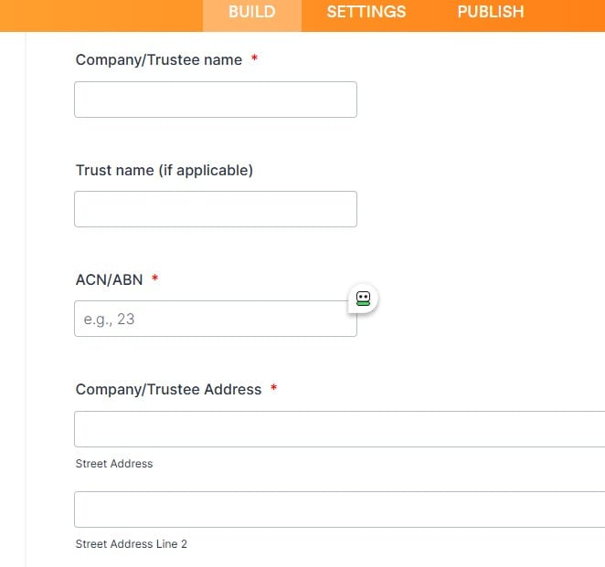 Clients operating as a company are guided through a tailored set of questions, including:- Company name and ACN