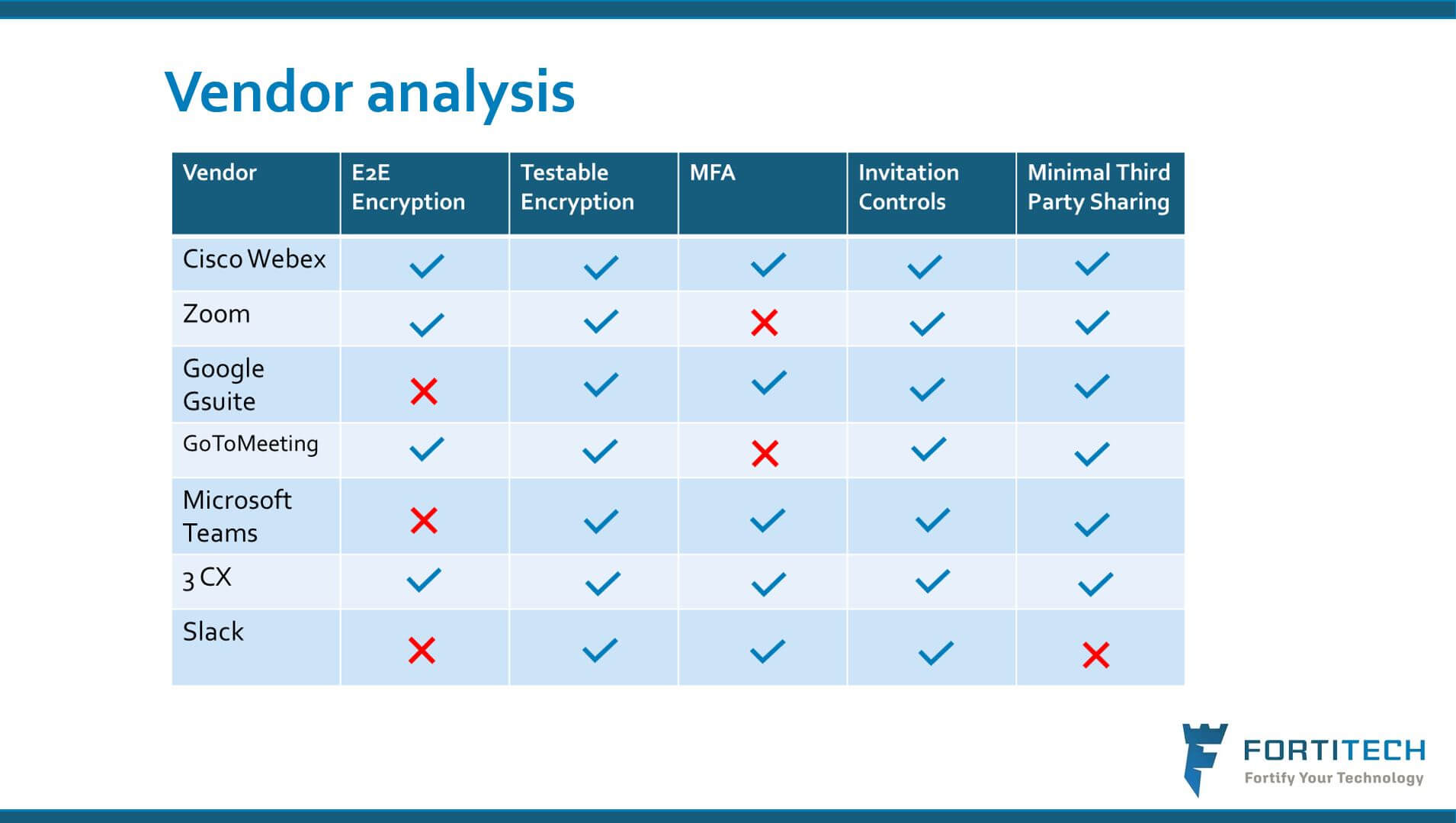 The head to head of popular vendors based on the above criteria shows Cisco Webex and 3CX to be the most secure overall at present.