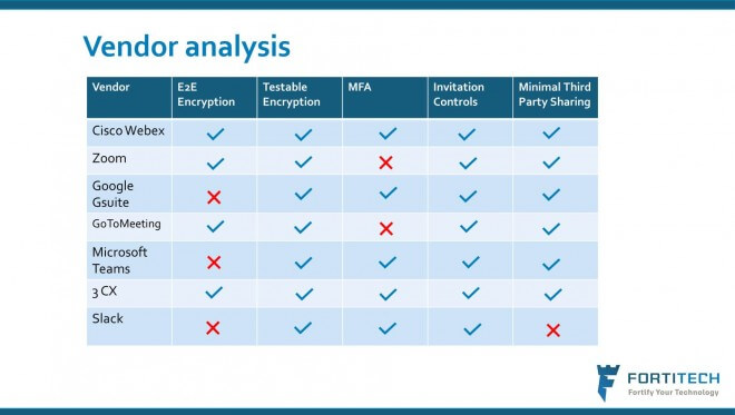 Another common concern of late is the security of web conferencing, whilst companies like Zoom have made steps to improve their overall security to prevent meetings being “hijacked” they still lag behind in areas such as multifactor authentication. David outlined the key security criteria for good web conferencing tools to use: