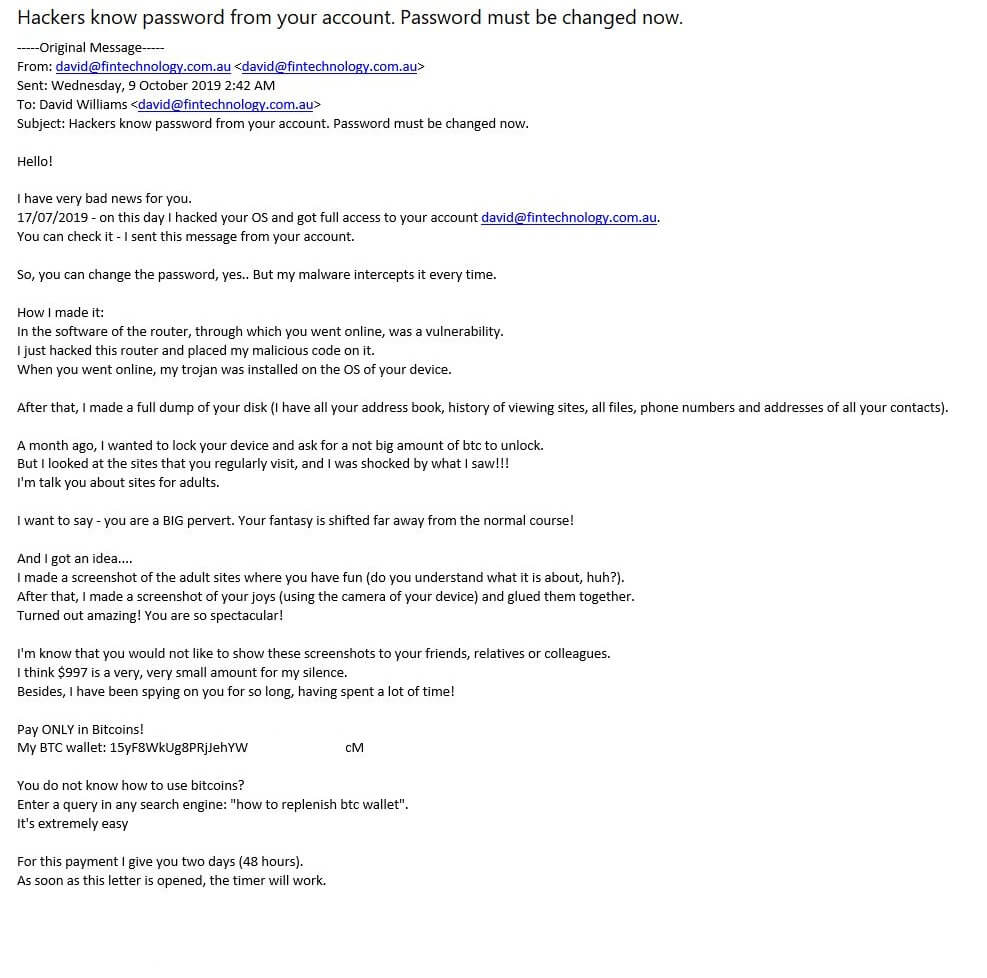 "Hackers know password from your account. Password must be changed now." the subject screamed.