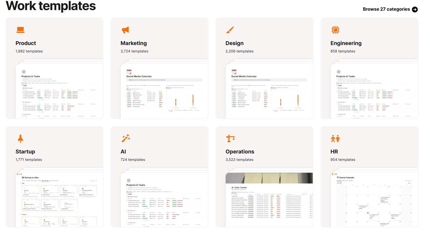 Notion provides a library of pre-built templates covering common business needs such as project tracking, meeting notes, customer