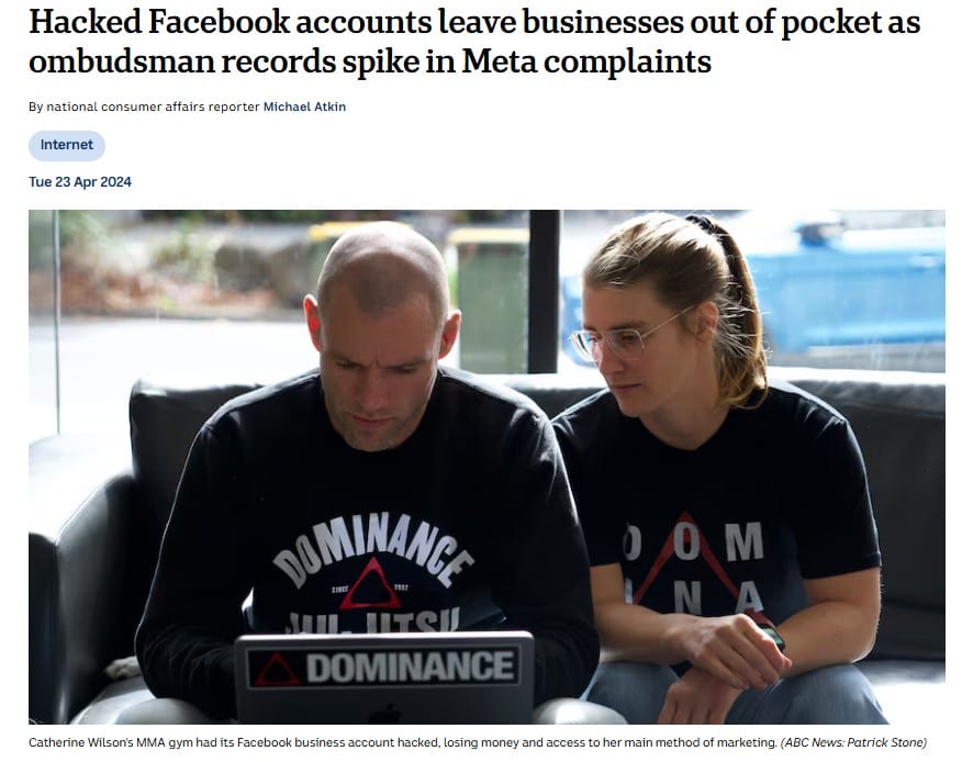 In April 2024, ABC News reported on a Melbourne MMA gym that lost access to its Facebook business account after it was hacked. Hackers ran ads using the business’s saved payment details, costing tens of thousands of dollars. The owner spent nine months trying to regain access, with limited support from Meta.