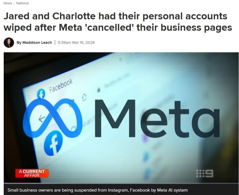 In March 2026, 9News highlighted a Canberra business owner whose Instagram business account was repeatedly suspended and reinstated before Meta disabled his personal account as well. Years of messages, photos and business communications were lost, despite paid verification services.