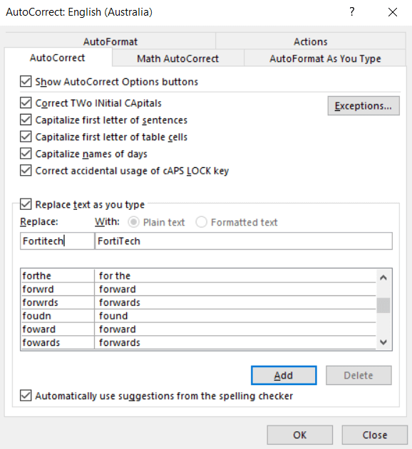 In our case, from now on Word will automatically correct the spelling of Fortitech to FortiTech.