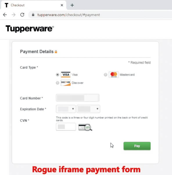 To unsuspecting users, the cyber heist was nearly undetectable. Upon trying to checkout from Tupperware’s online store, victims would first be shown a fraudulent, convincing payment form that asked for their credit card number, expiration date, and three-digit security code.